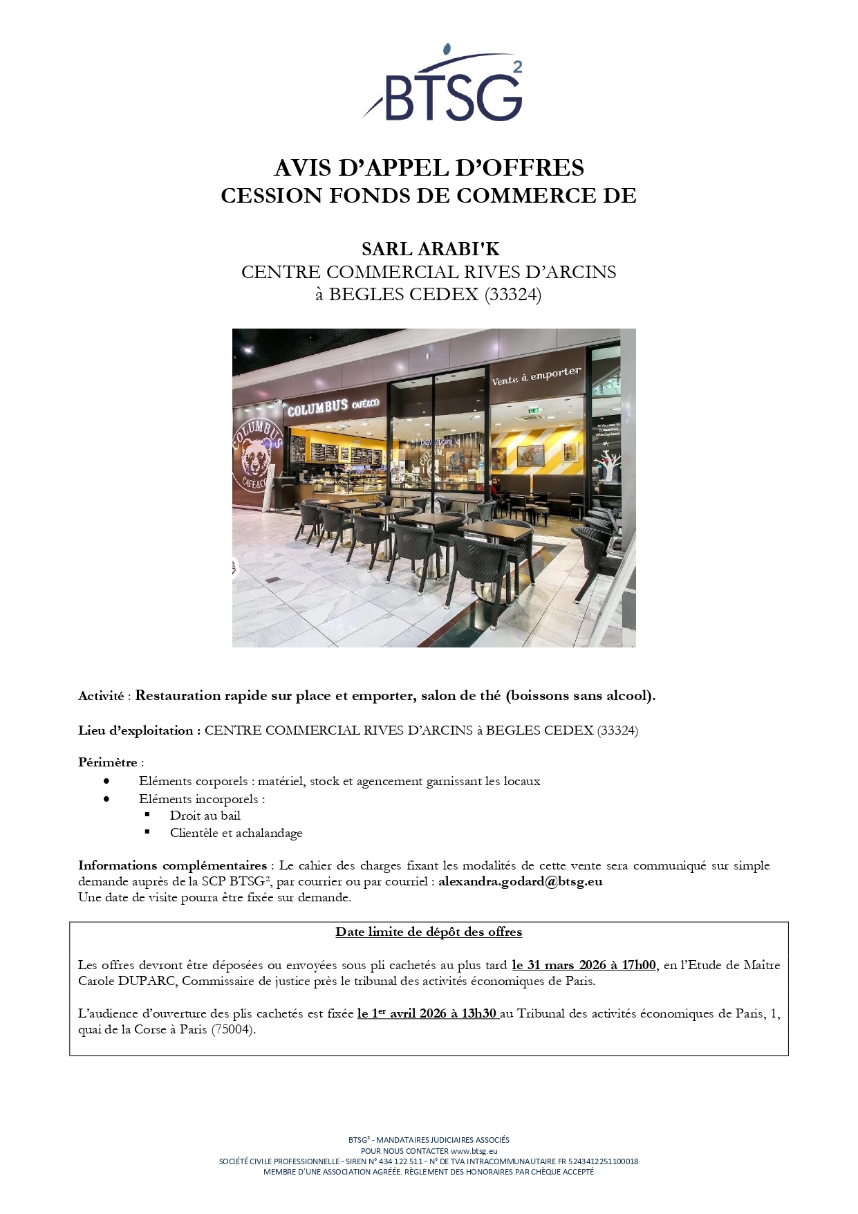 La cession des fonds de commerce dépendant de la liquidation judiciaire de la SARL ARABI'K est envisagée.